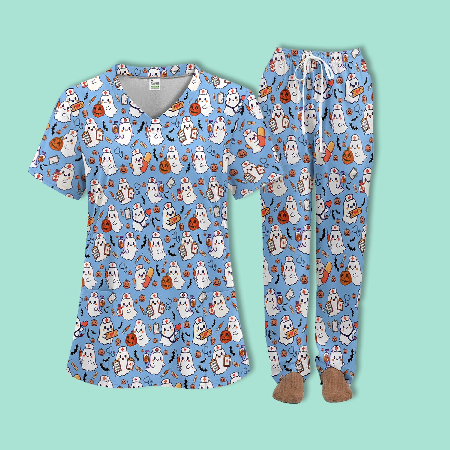 Ghost Nurse Medical Uniform - Cute Boo Halloween Scrub Set - Purple Pumpkin Scrub Pants - Funny Halloween Sweatshirts