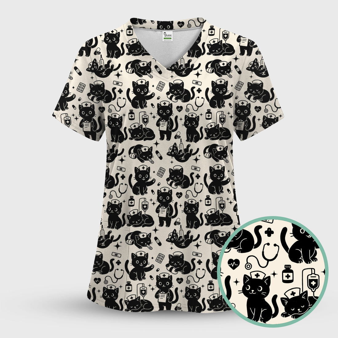Cute Black Cat Nurse Pattern Scrub Top, Breathable Fabrics Nursing Uniform