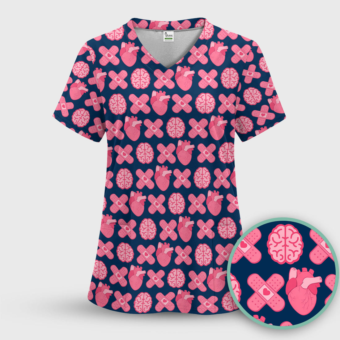 Heart & Brain Medical Icon Pattern Scrub Top, Breathable Fabrics Nursing Uniform