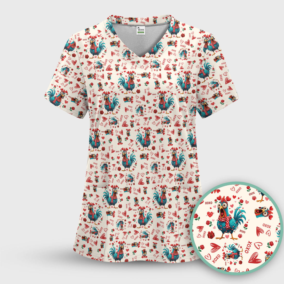 Funny Rooster Valentine Scrub Top, Cute Chicken XOXO Heart Pattern Nurse Shirt, Breathable Fabrics Nursing Uniform
