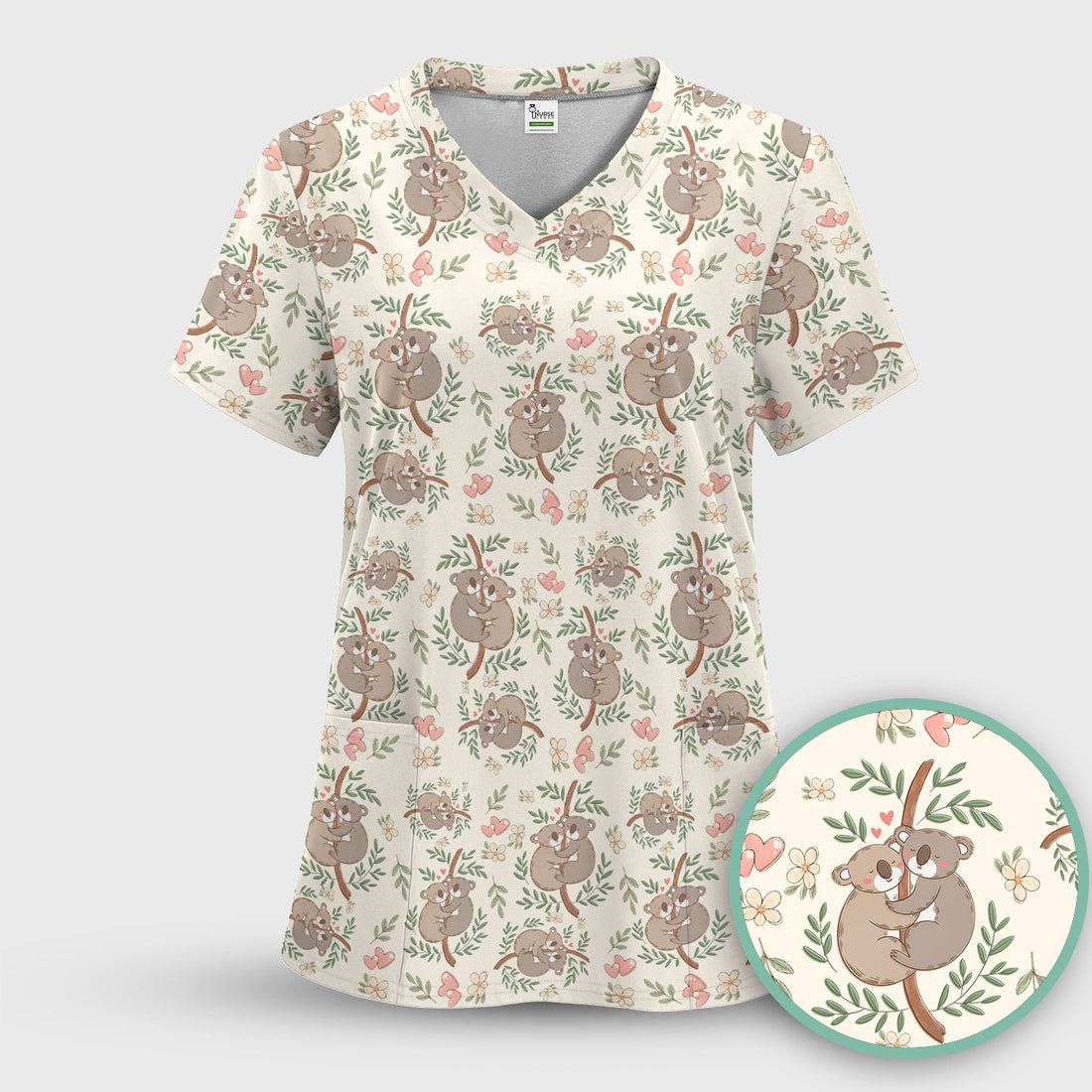 Cute Koala Love Pattern Medical Scrub Top, Breathable Fabrics Nursing Uniform