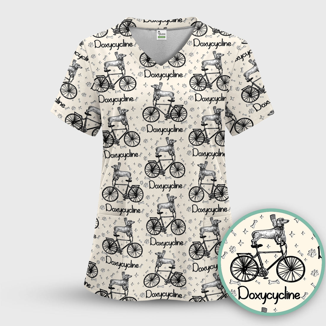 Funny Doxycycline Dog Bicycle Print Scrub Top, Comfortable Scrubs for Nurses
