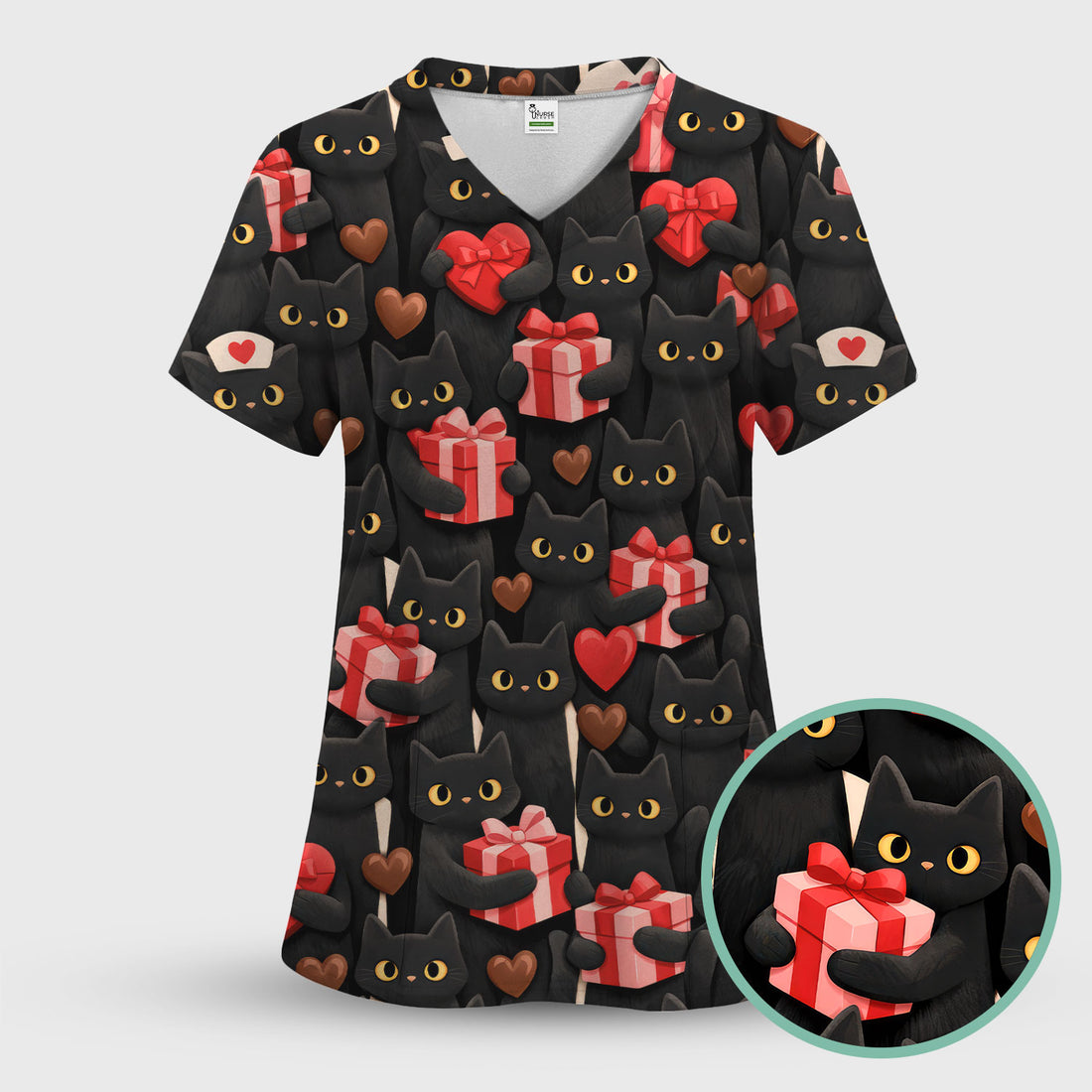 Valentine’s Day Scrub Top, Cute Black Cat With Heart Pattern Nurse Shirt, Breathable Fabrics Nursing Uniform