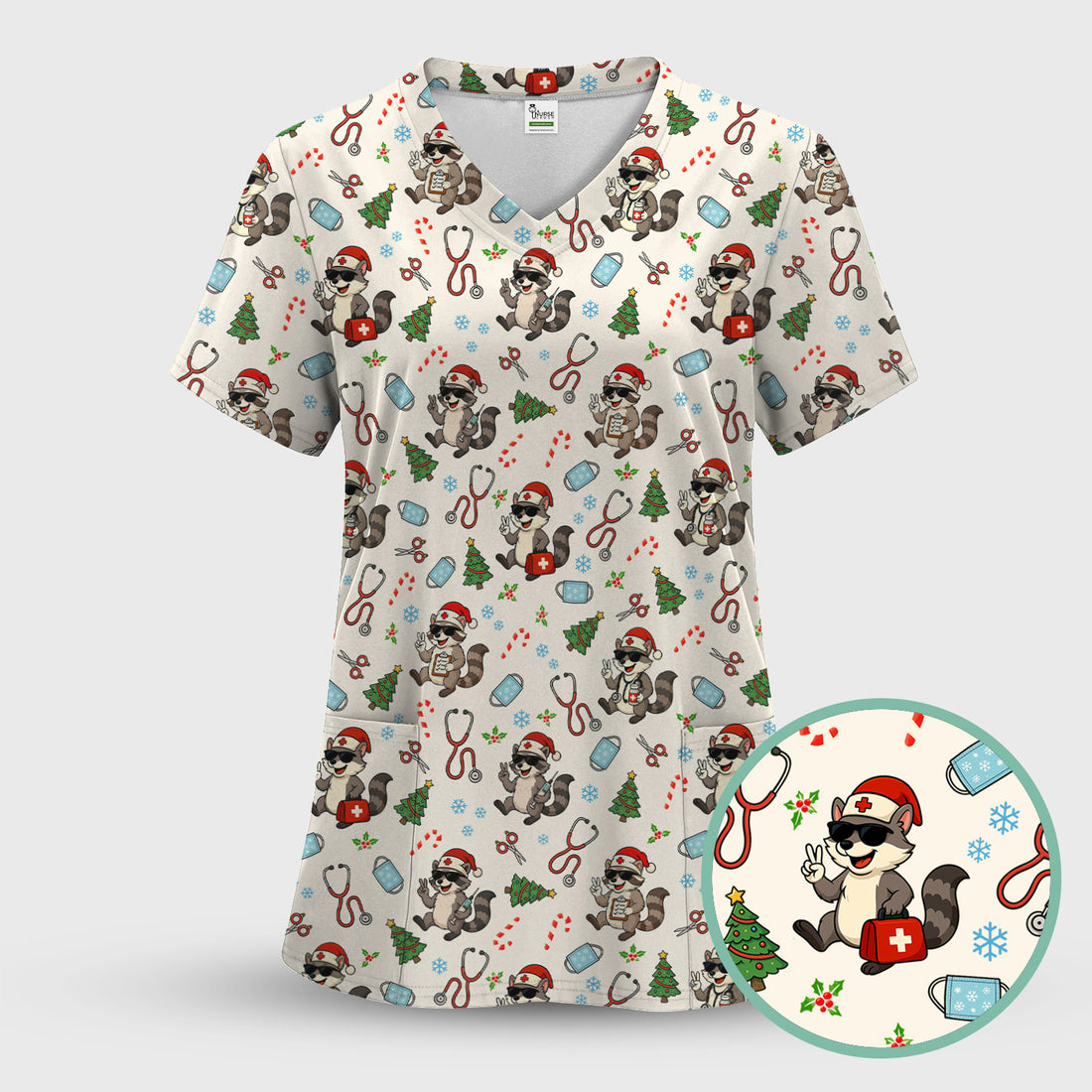 Christmas Scrub Top for Nurses - Funny Raccoon and Medical Tools Pattern - Festive Holiday Nurse Scrubs Shirt Gift for Women RN LPN CNA