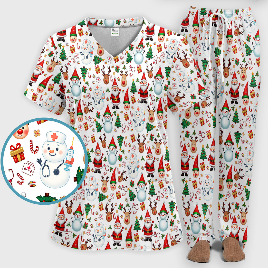 Christmas Scrub Set for Nurses - Cute Snowman Reindeer Santa Pattern - Holiday Medical Uniform RN CNA LPN Gift