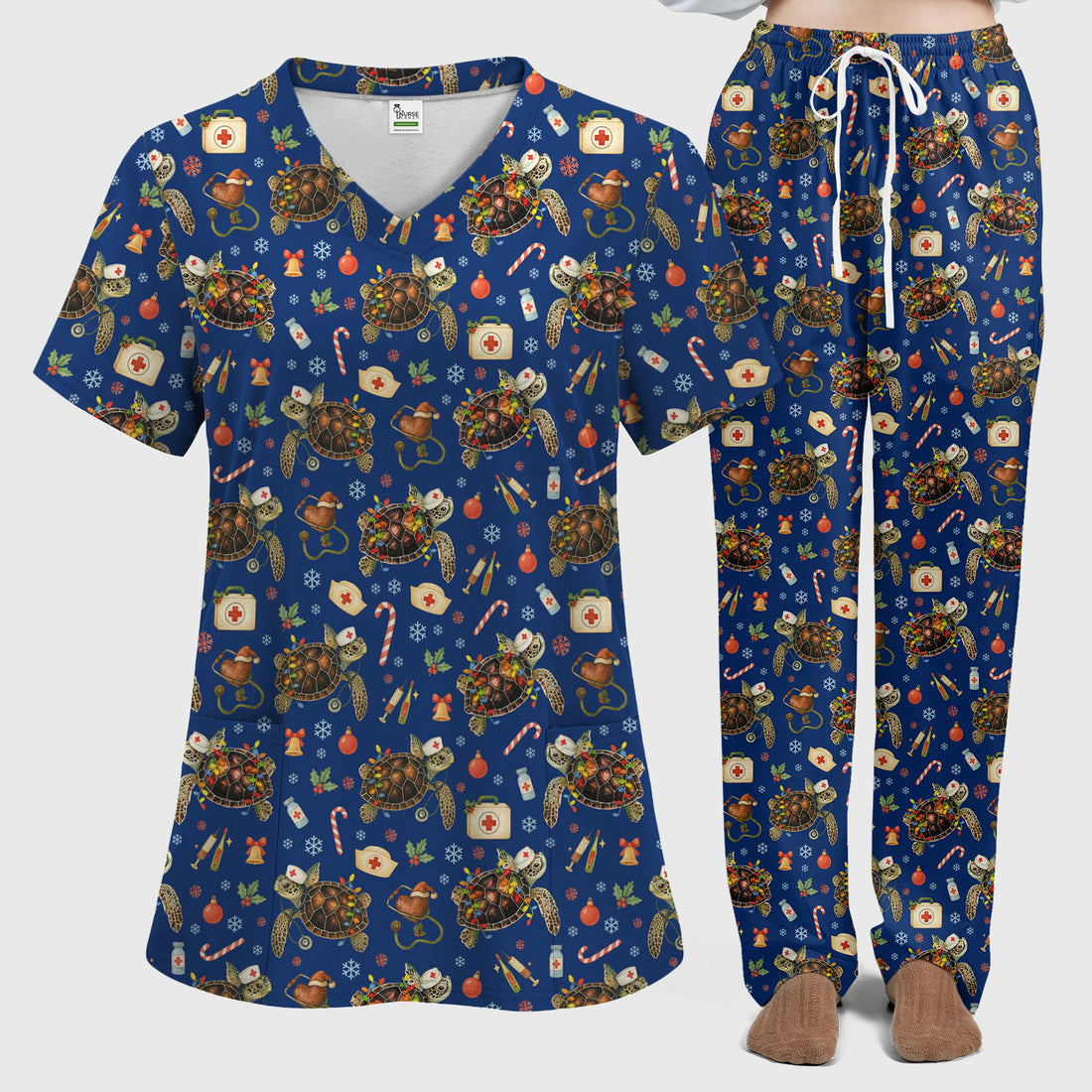 Christmas Turtle Scrub Set for Women - Cute Sea Turtle Nursing Pants and V Neck Top - Festive Holiday Gift for CNA LPN RN