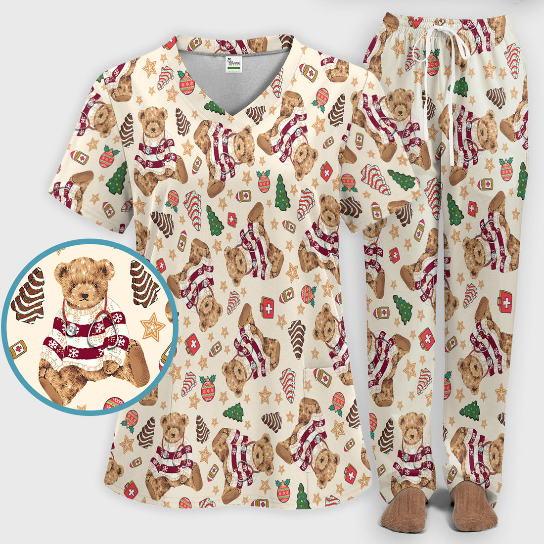 Christmas Teddy Bear Scrub Set for Nurses - Cozy Holiday Pattern with Cute Bear and Medical Icons Scrubs Pants and V Neck Top