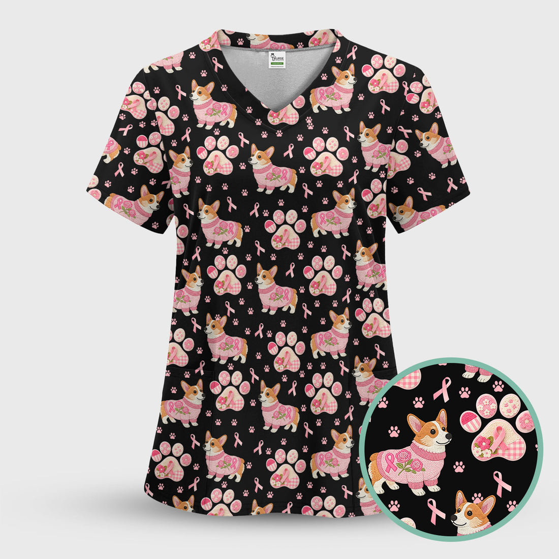 Corgi Pink Ribbon Scrub for Women - Breast Cancer Awareness Shirt - Floral Dog Paw Print Nursing Uniform - Support Gift