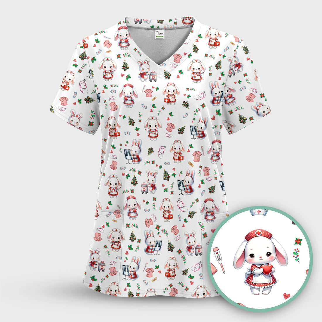 Comfortable Scrubs for Nurses - Funny Bunny Scrub Top - Rabbit Christmas Shirt - Xmas Med Uniform for Women