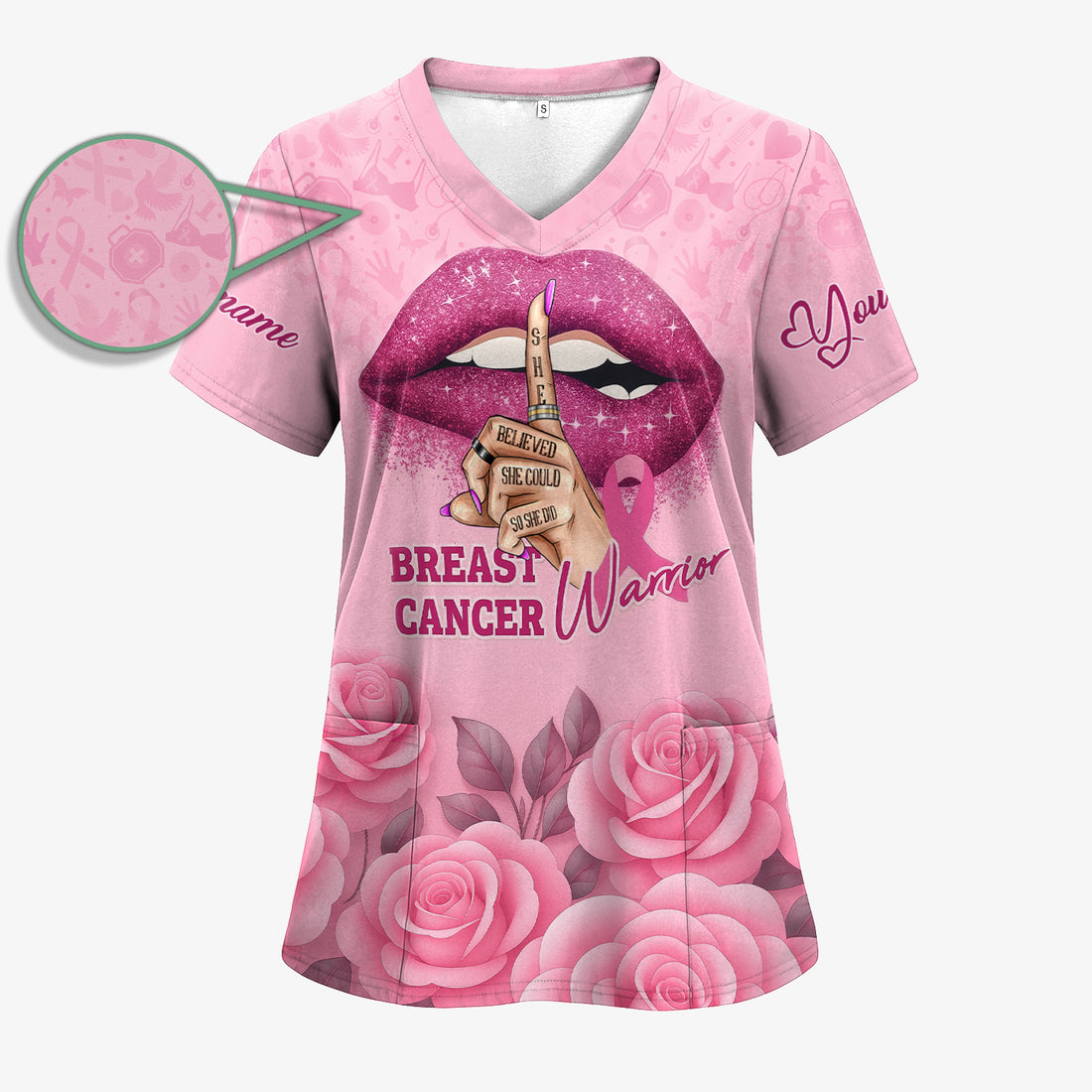 Custom Breast Cancer Awareness Floral Scrub - Pink Ribbon & Rose Pattern Graphic - Gift for RN LPN CNA