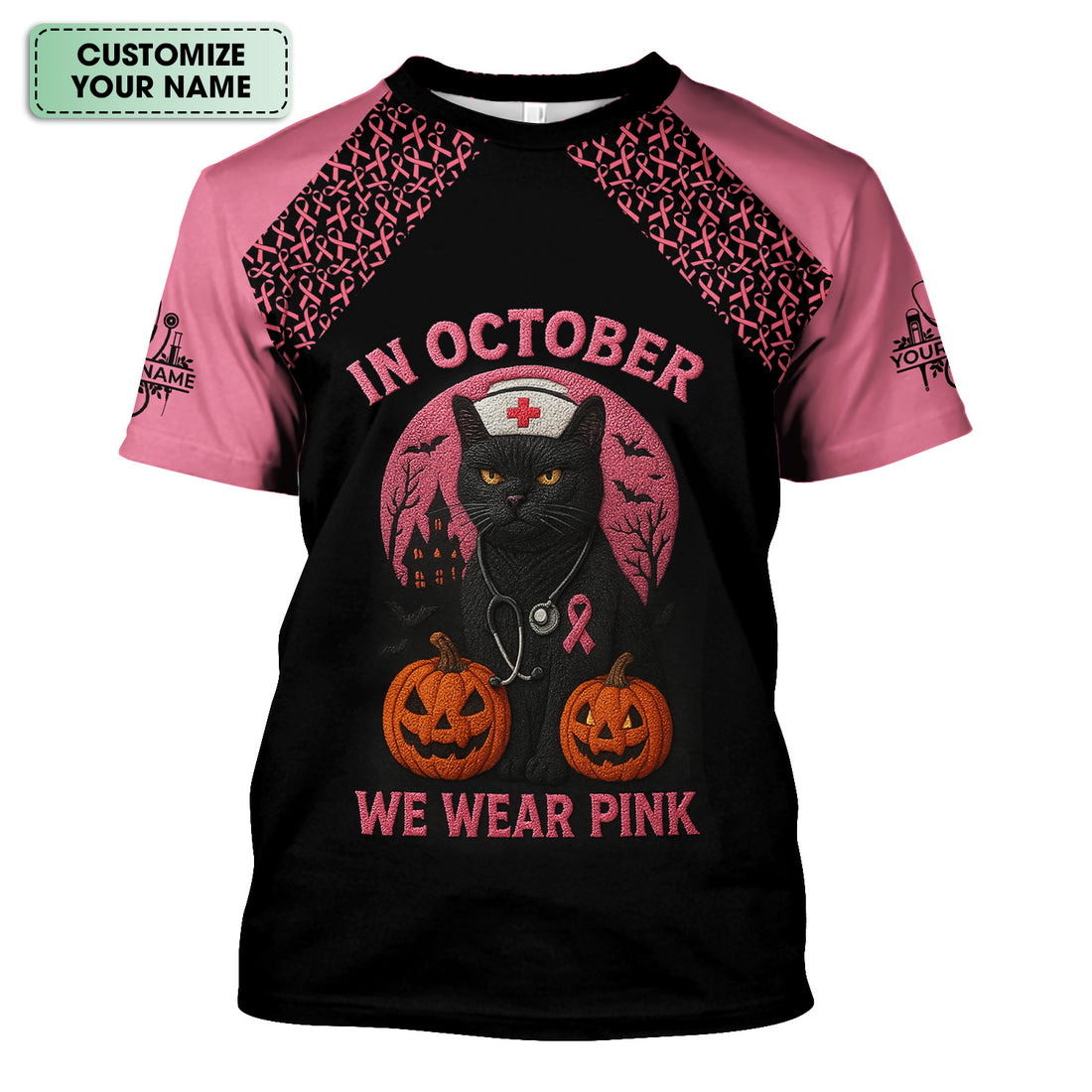 Custom Breast Cancer Awareness Nurse Shirt - In October We Wear Pink Halloween Cat Tee - CNA RN LPN Nursing Apparel Gift