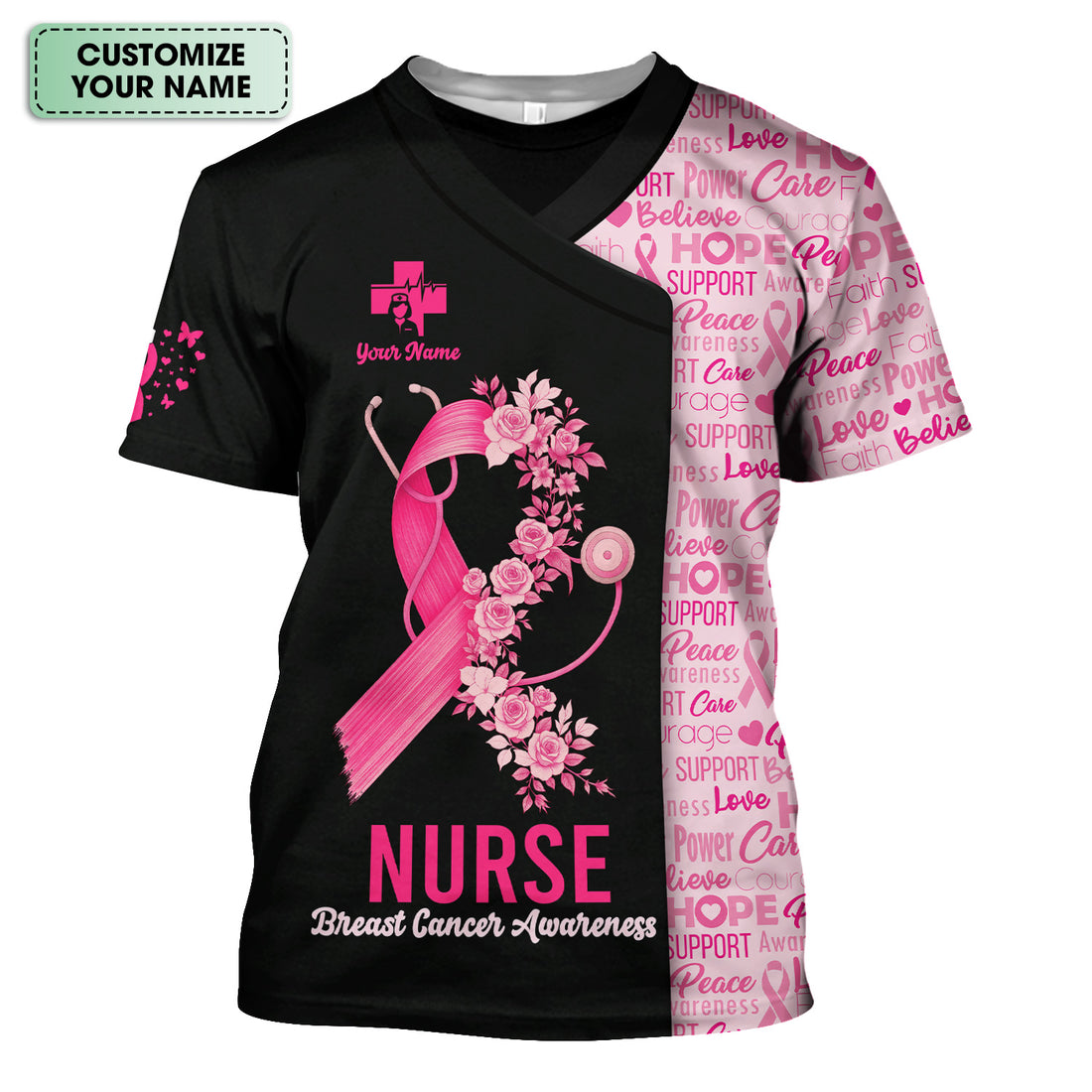Custom Breast Cancer Awareness Nurse Shirt - Pink Ribbon Butterfly Nurse & Rose Floral Design - RN LPN CNA Gift