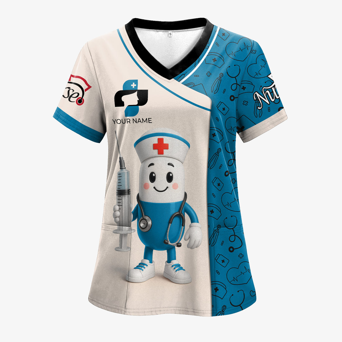 Custom Nursing Cartoon Scrub Top for Women - Medical Pill Character Holding Syringe Design for RN LPN CNA - Funny Healthcare Gift Multiple Color Options