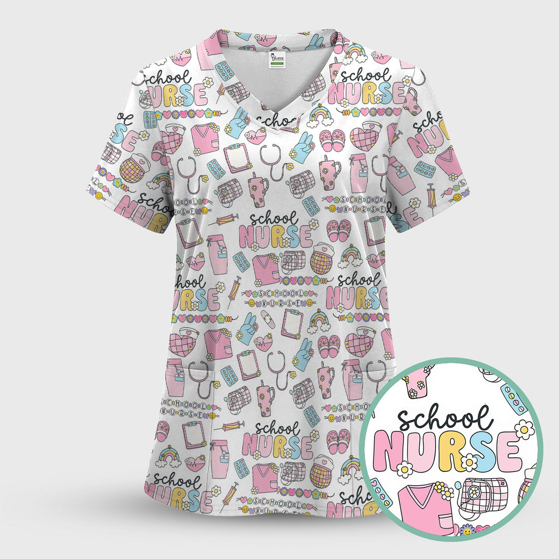 Cute School Nurse Scrub Top - Doodle Style Rainbow & Stethoscope Design - Gift for Women RN LPN & School Nurses