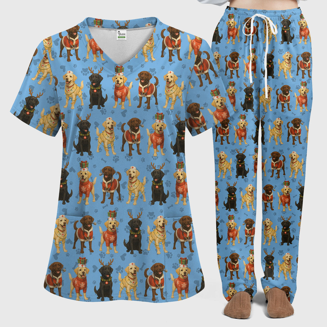 Dog Scrubs Christmas Set for Women - Labrador Puppy Pattern Scrub Top & Pants - Holiday Christmas Scrubs with Cute Dog Print