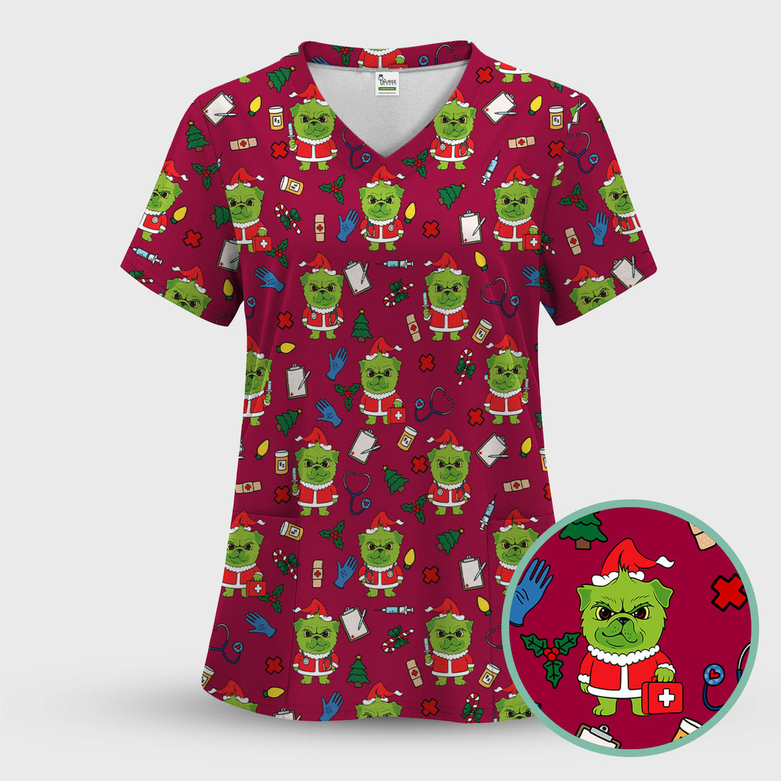 Dog Christmas Scrub Top - Funny Grinchy Puppy and Medical Icons Pattern - Cute Holiday Scrubs Perfect for Nurses