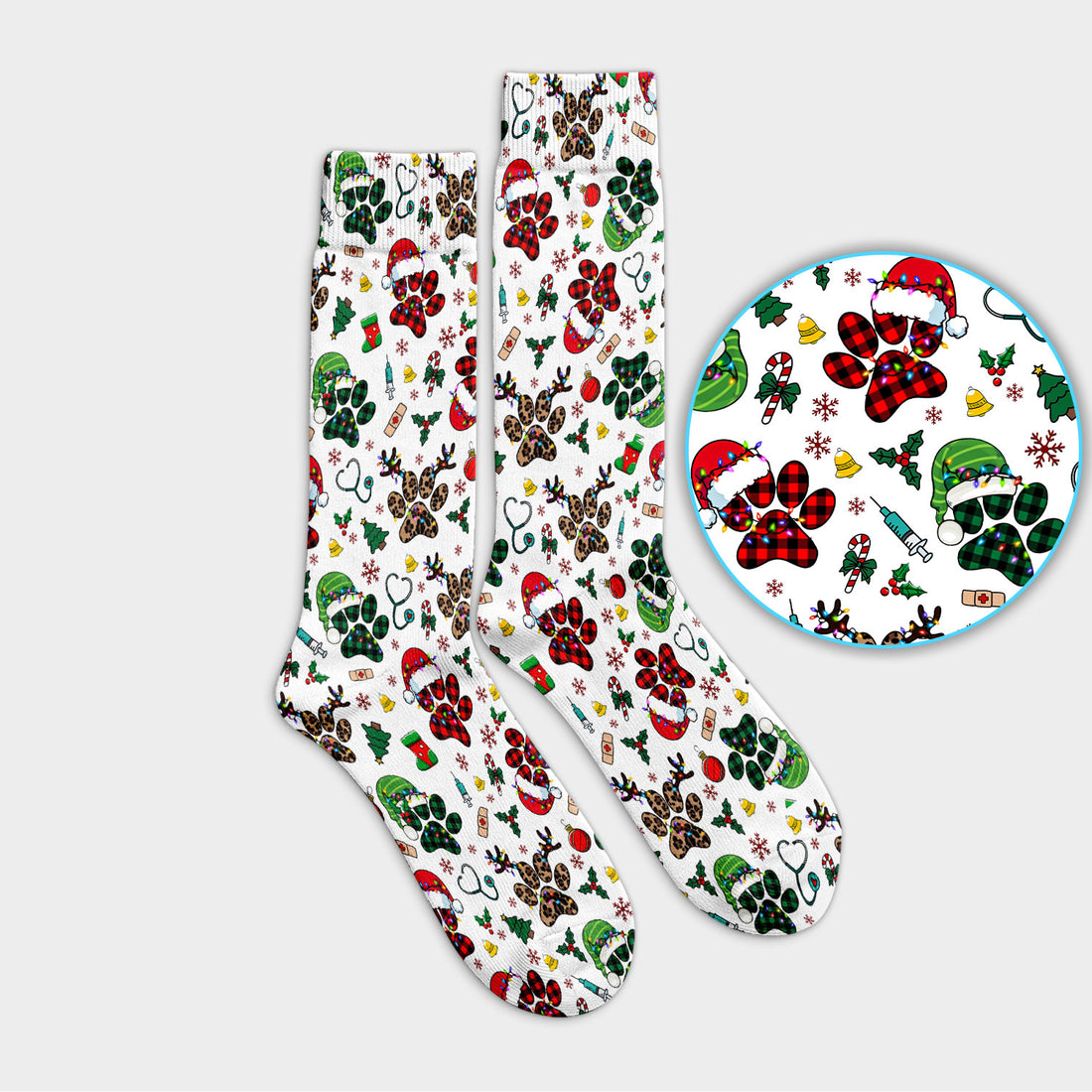 Dog Paw Print Christmas Socks for Nurse Doctor - Cute Leopard Pattern Adult Socks for Men and Women - Breathable Medical Uniform