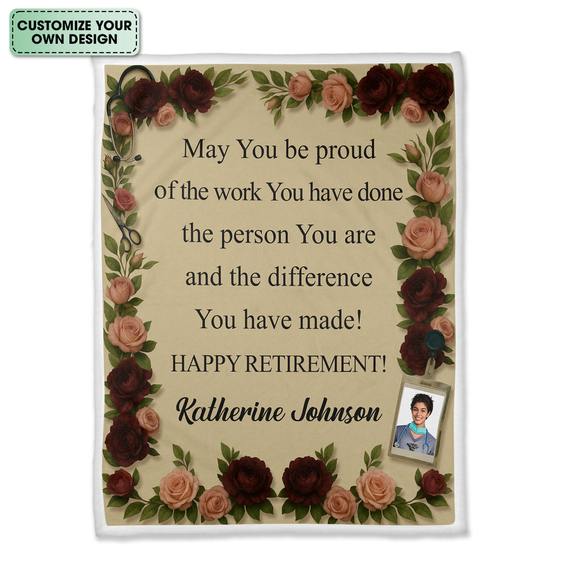 Custom Retirement Blanket with Name & Photo - Floral Border with Inspirational Quote - Gift for Nurse, RN, LPN, Medical Staff