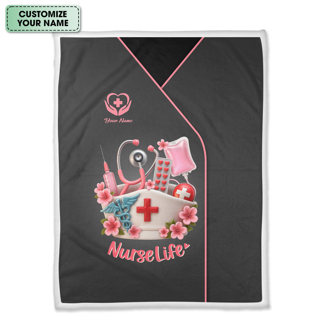 Custom Name Nurse Blanket - 3D Pink Stethoscope & Syringe Graphic - Gift for Female Nursing Students and Workers