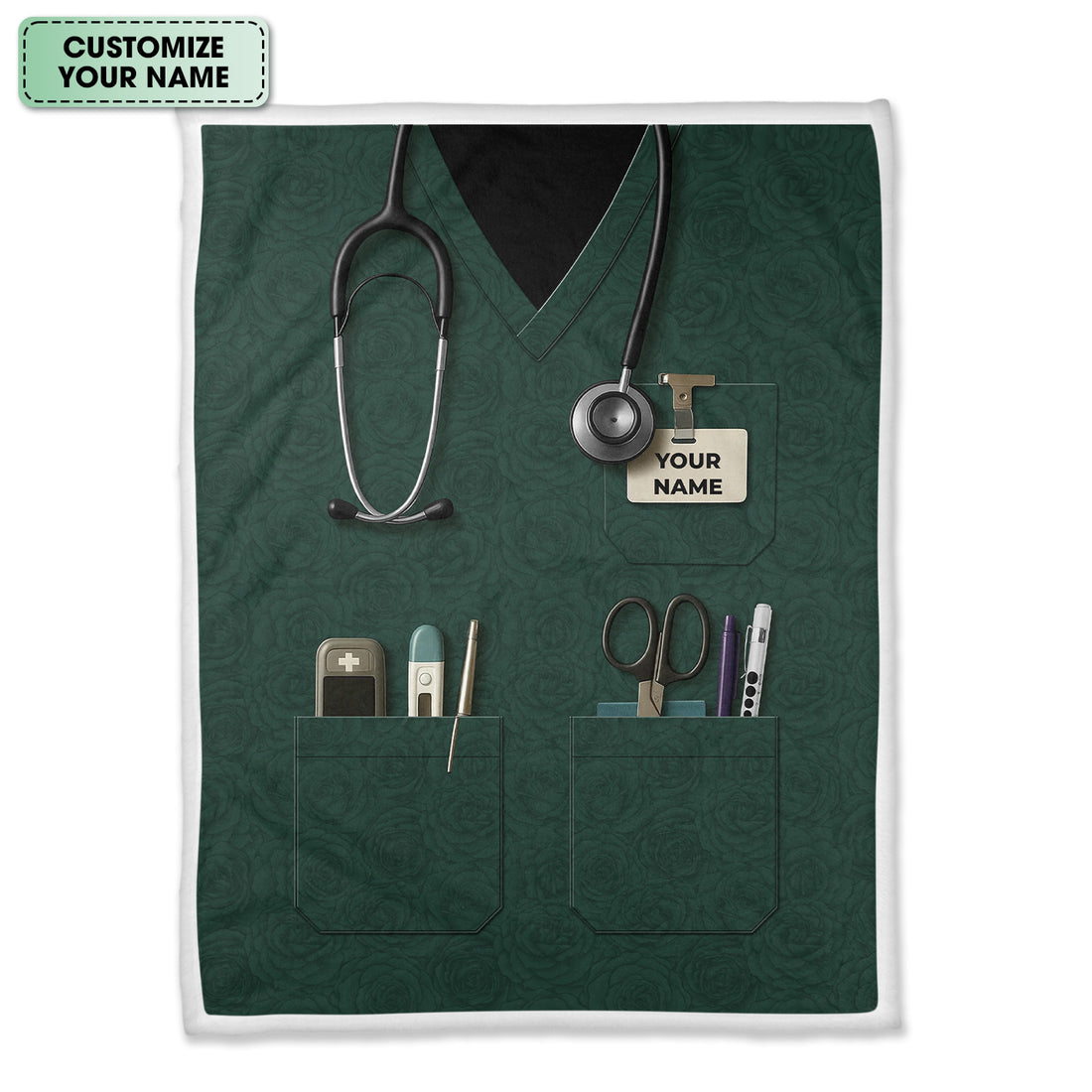Green Scrub Nurse Throw Blanket - Medical Uniform Design with Pockets and Name - Gift for Female Nurses, CNA, LPN, RN