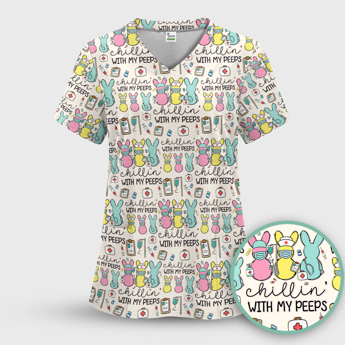Cute Bunny Nurse Chillin With My Peeps Scrub Top, Comfortable Scrubs for Nurses, Easter