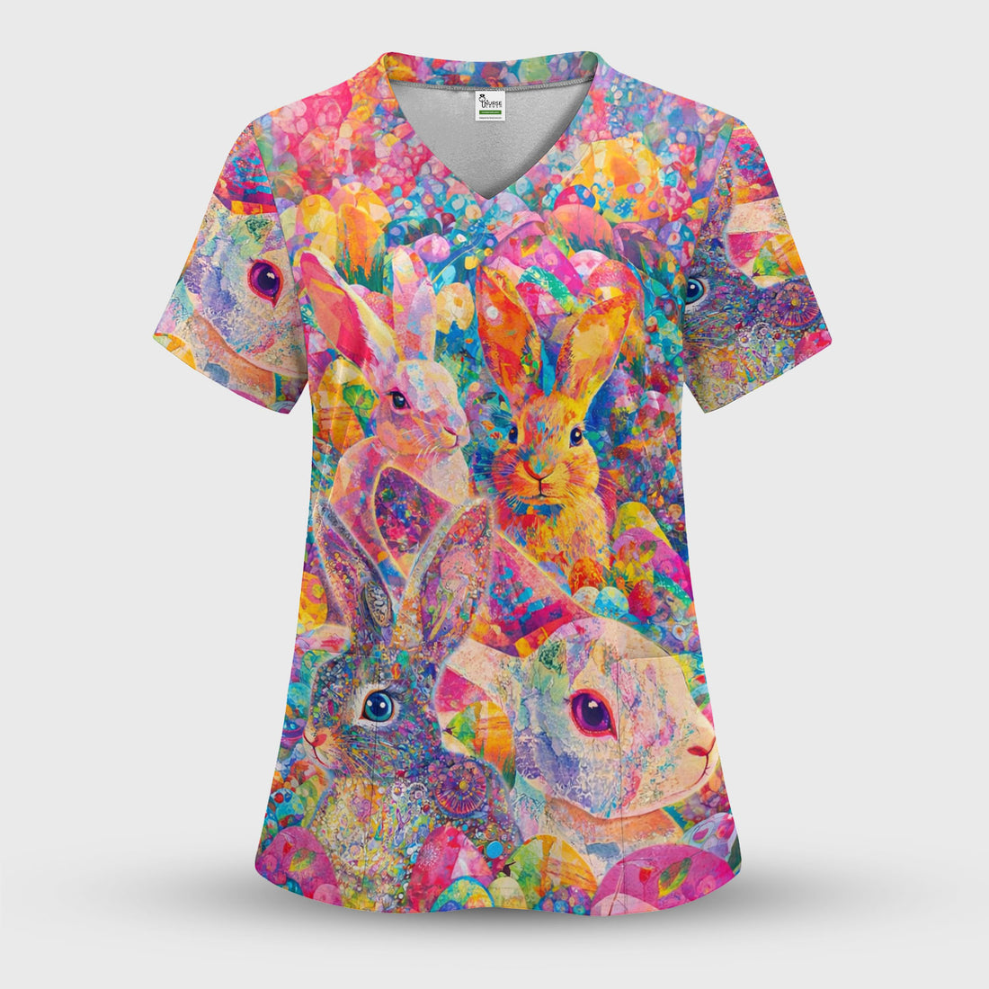 Colorful Artistic Bunny Print Scrub Top, Breathable Fabrics Nursing Uniform, Easter