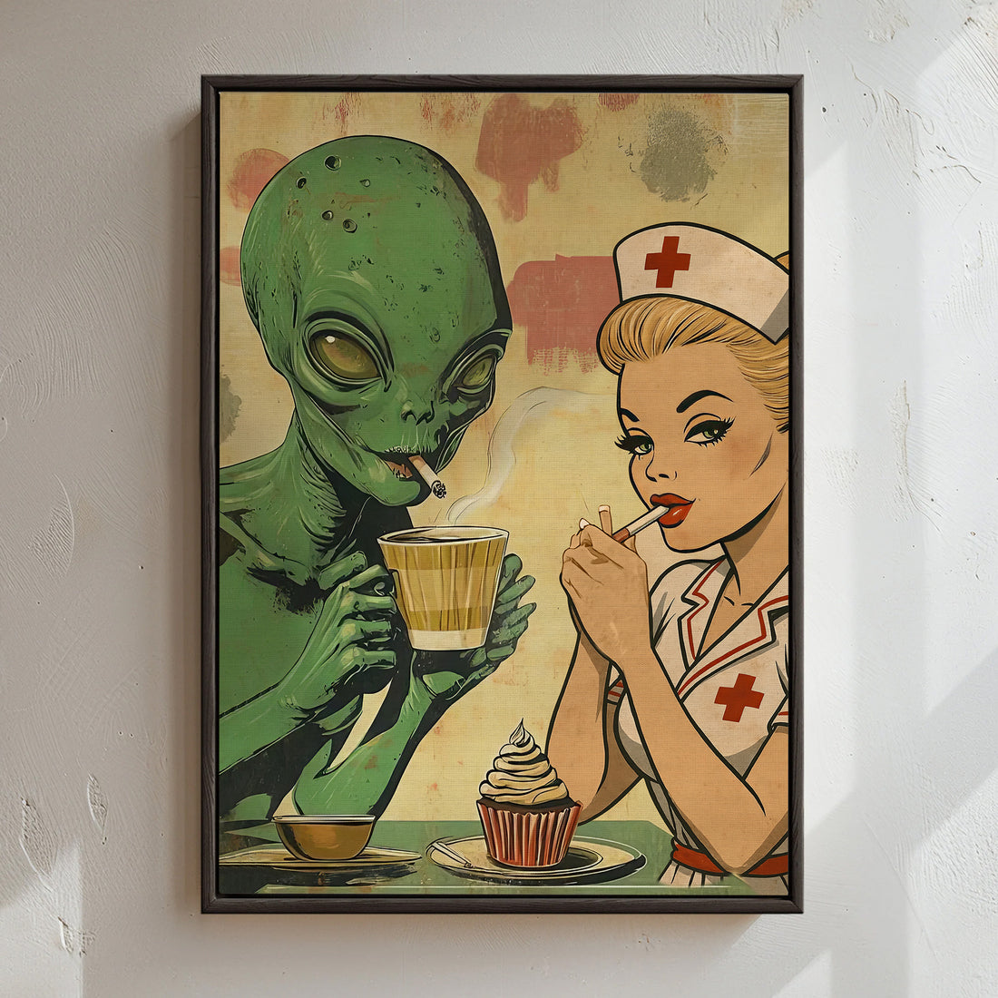 Funny Vintage Nurse & Alien Canvas, Retro Pop Art Smoking & Coffee Time Wall Art, RN LPN CNA Gift