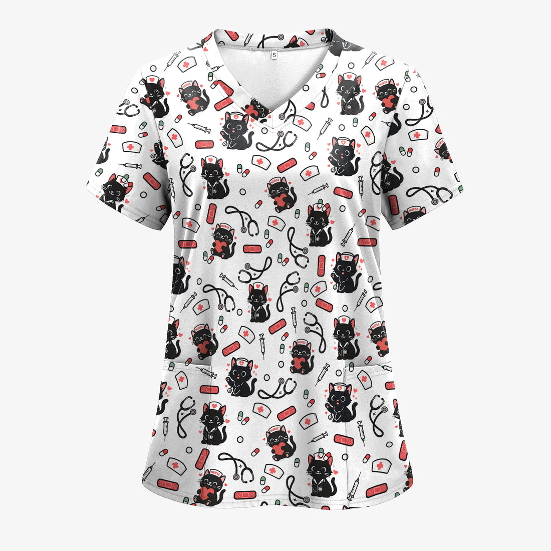 Cute Black Cat Nurse Scrub Top for Women - Medical Uniform Shirt with Stethoscope & Pill Print - Gift for CNA, LPN, Medical Worker
