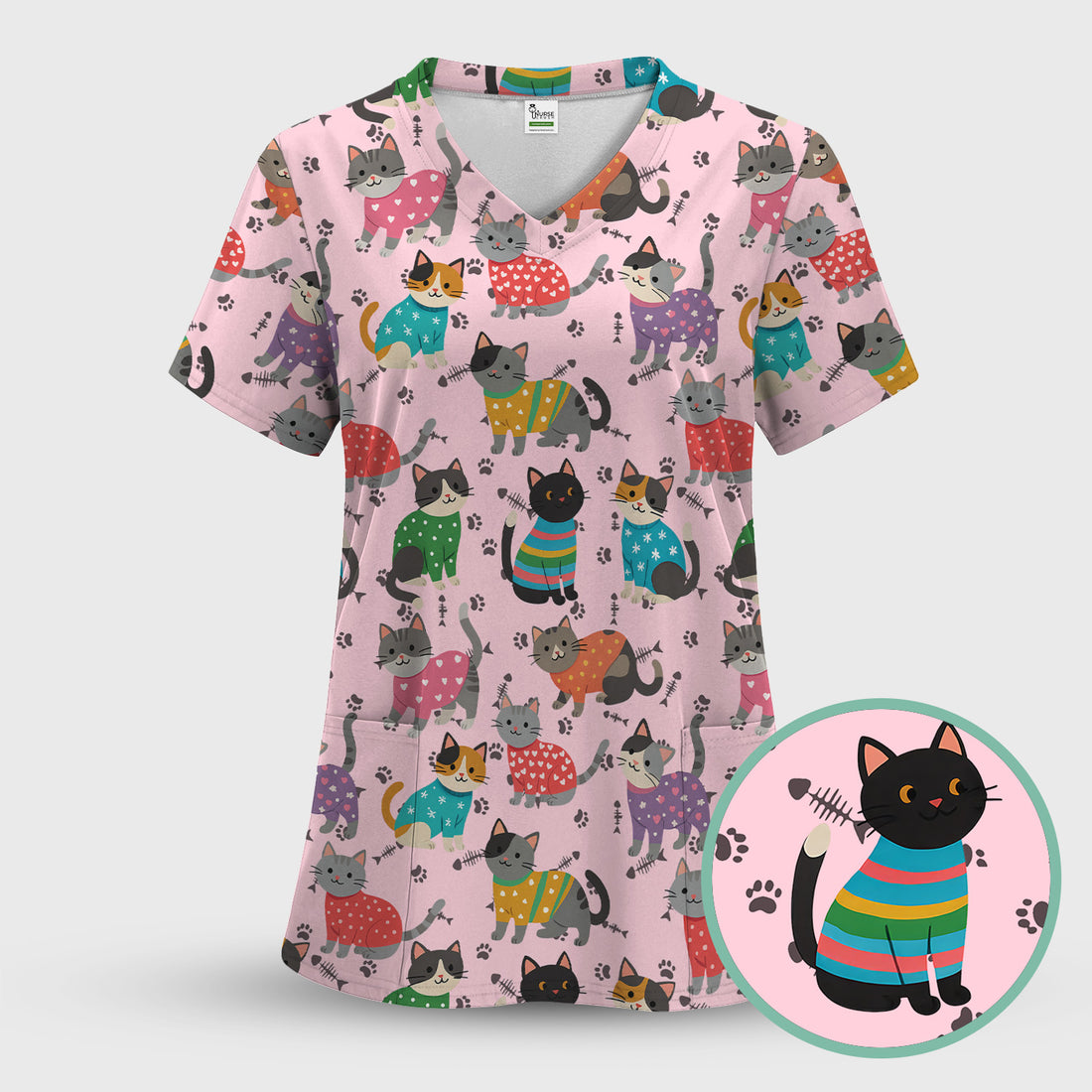Custom Cat Scrub Top Multi Color - Cute Kitty Print Scrub Shirt for Nurses - Funny Colorful Nursing Workwear with Pockets