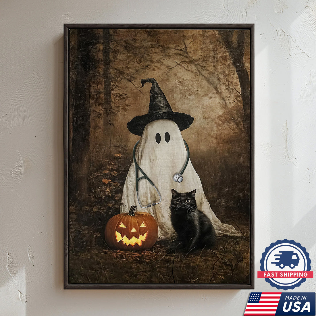 Halloween Nurse Ghost Canvas, Spooky Pumpkin Black Cat Wall Art, RN LPN CNA Gift