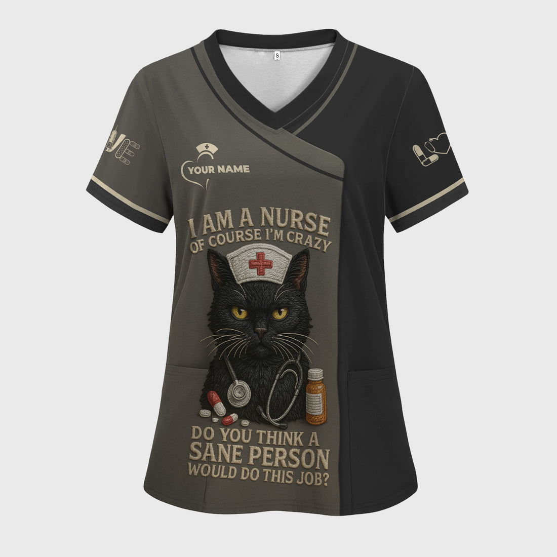 Personalized Funny Black Cat Nurse Scrub Top - Crazy Cute Cat Nurse Medical Design - Gift for RN LPN CNA Nursing Staff