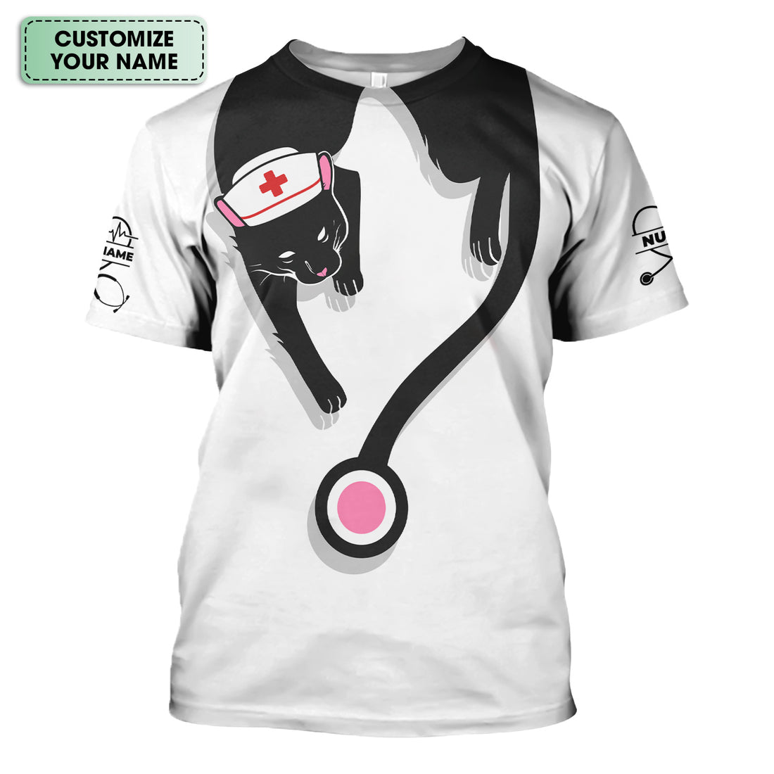 Personalized Black Cat Nurse Shirt - Funny Cat Lover Medical Tee for Women - Gift for RN LPN CNA