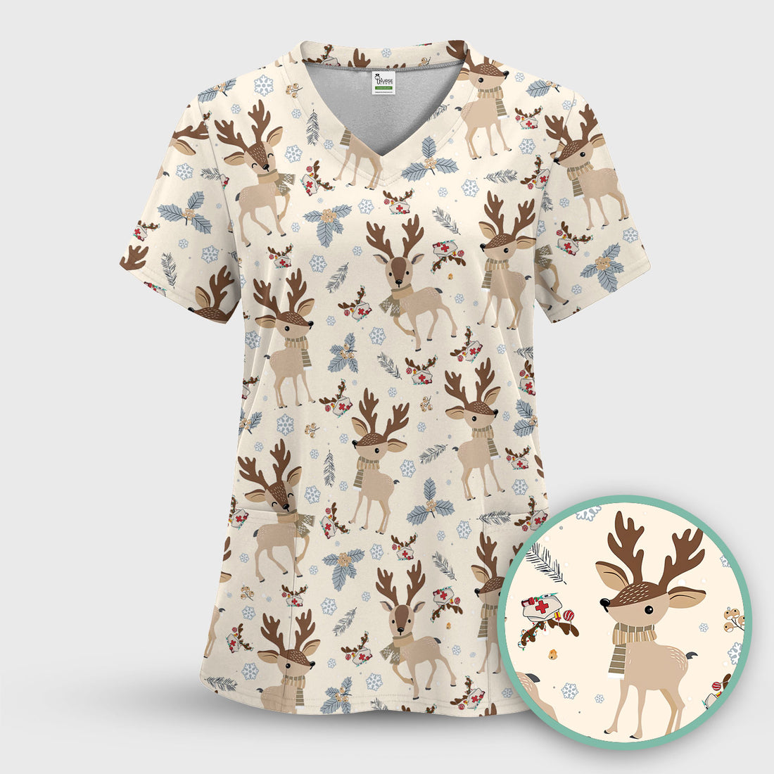 Reindeer Christmas Scrub Top - Cozy Beige Holiday Nurse Shirt with Cute Deer Pattern - Festive Medical Scrubs for Women RN CNA LPN