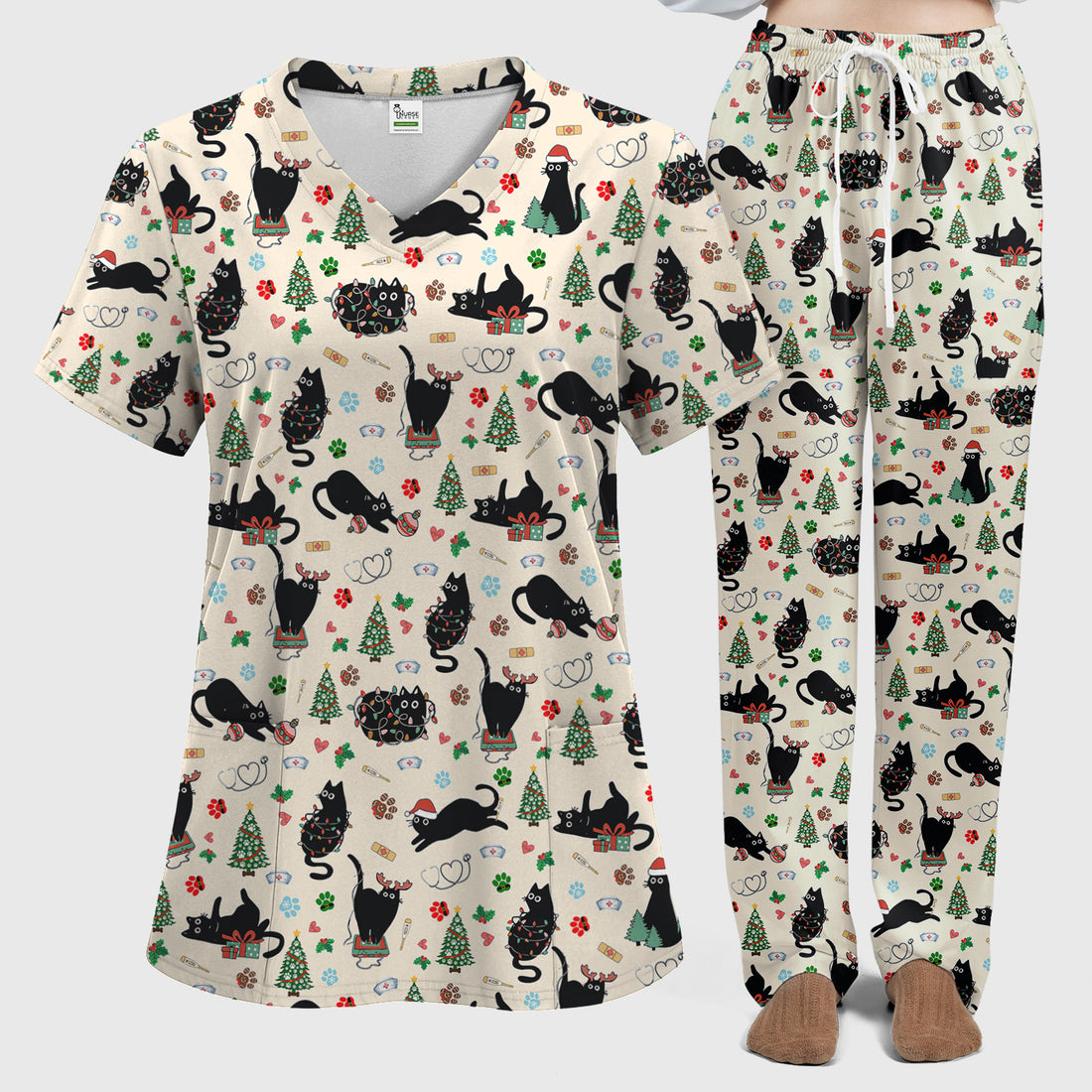 Christmas Cat Scrub Set for Nurse - Funny Black Cats Scrubs Pants and V Neck Top - Cute Holiday Medical Uniform for Women