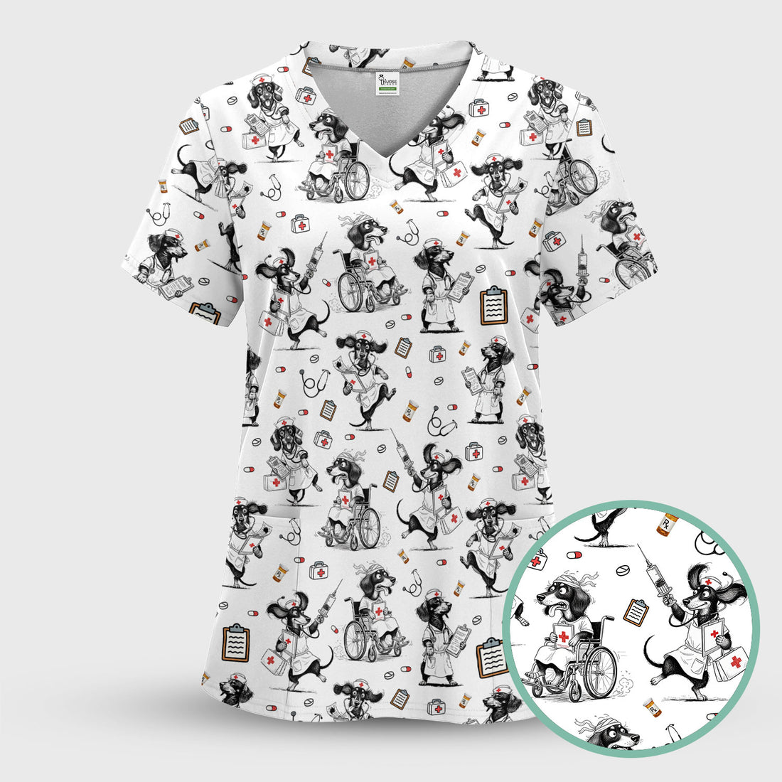 Cute Sausage Dog Scrub Top for Nurses - Colorful Dachshund Print Medical Work Shirt - Fun Wiener Dog Pattern Veterinary Apparel