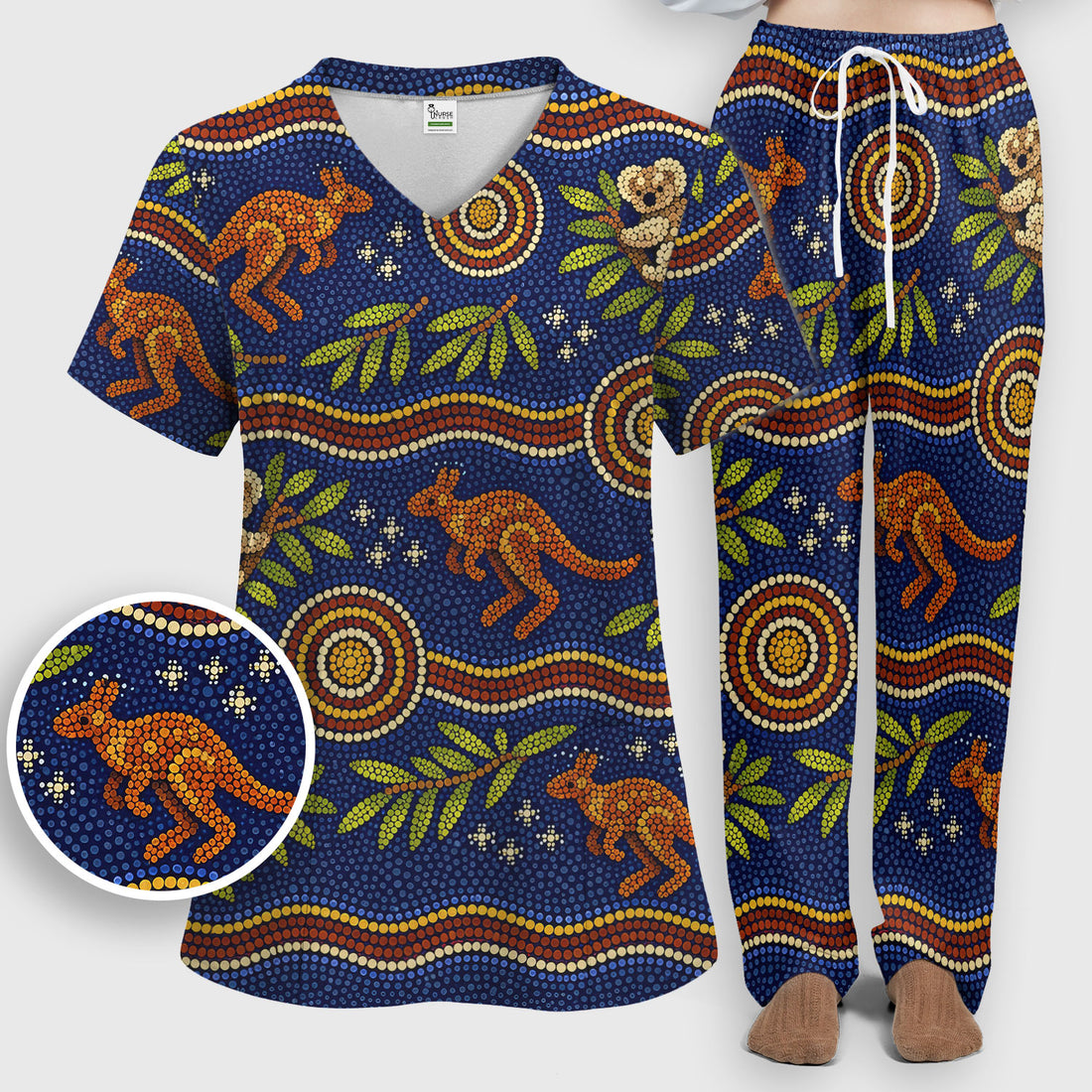 Australian Aboriginal Dot Art Scrub Set, Kangaroo ANd Koala Pattern Nurse Shirt, Breathable Fabrics Nursing Uniform
