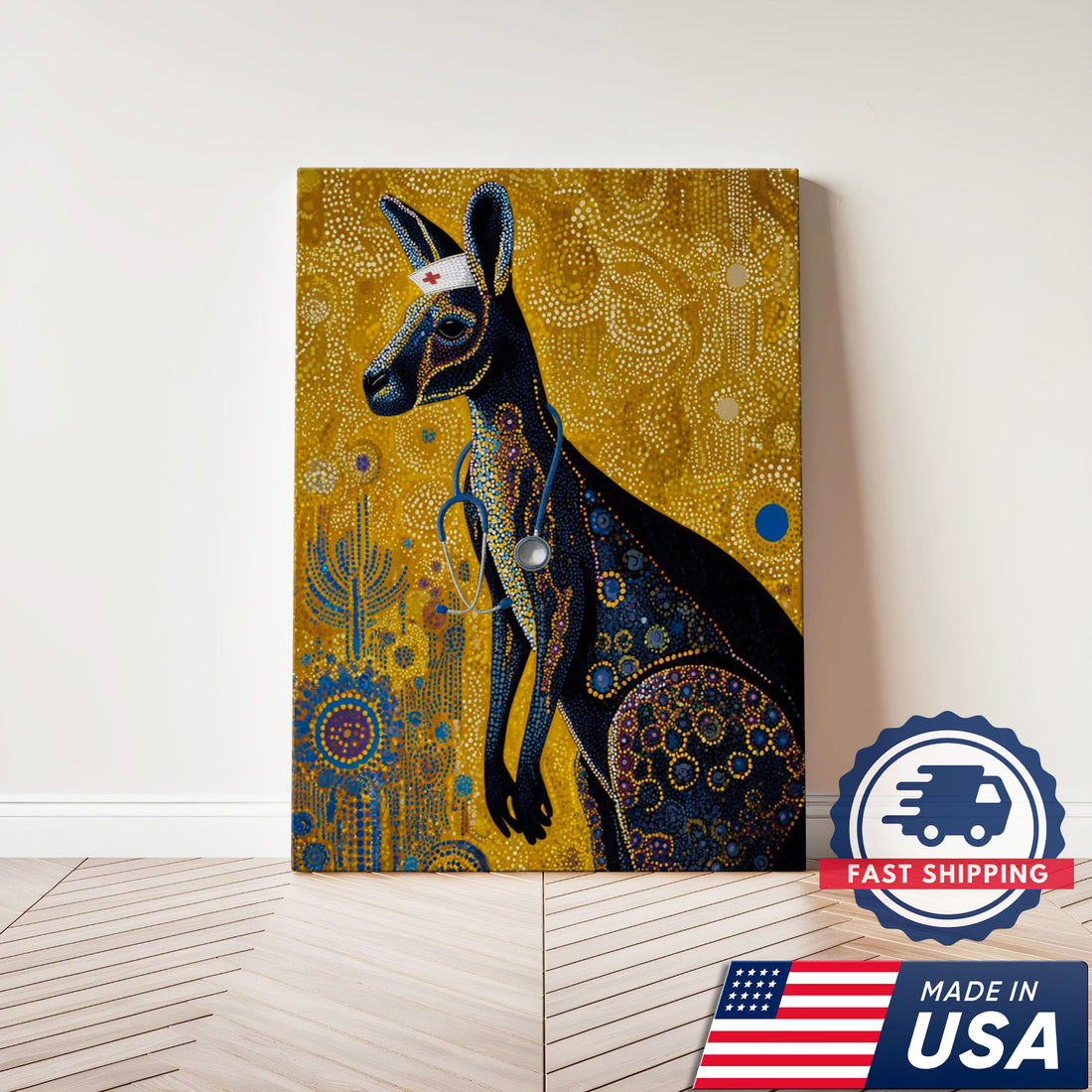 Aboriginal Style Kangaroo Canvas, Kangaroo Nurse Dot Art Poster, Australian Wildlife Decor For Nursing