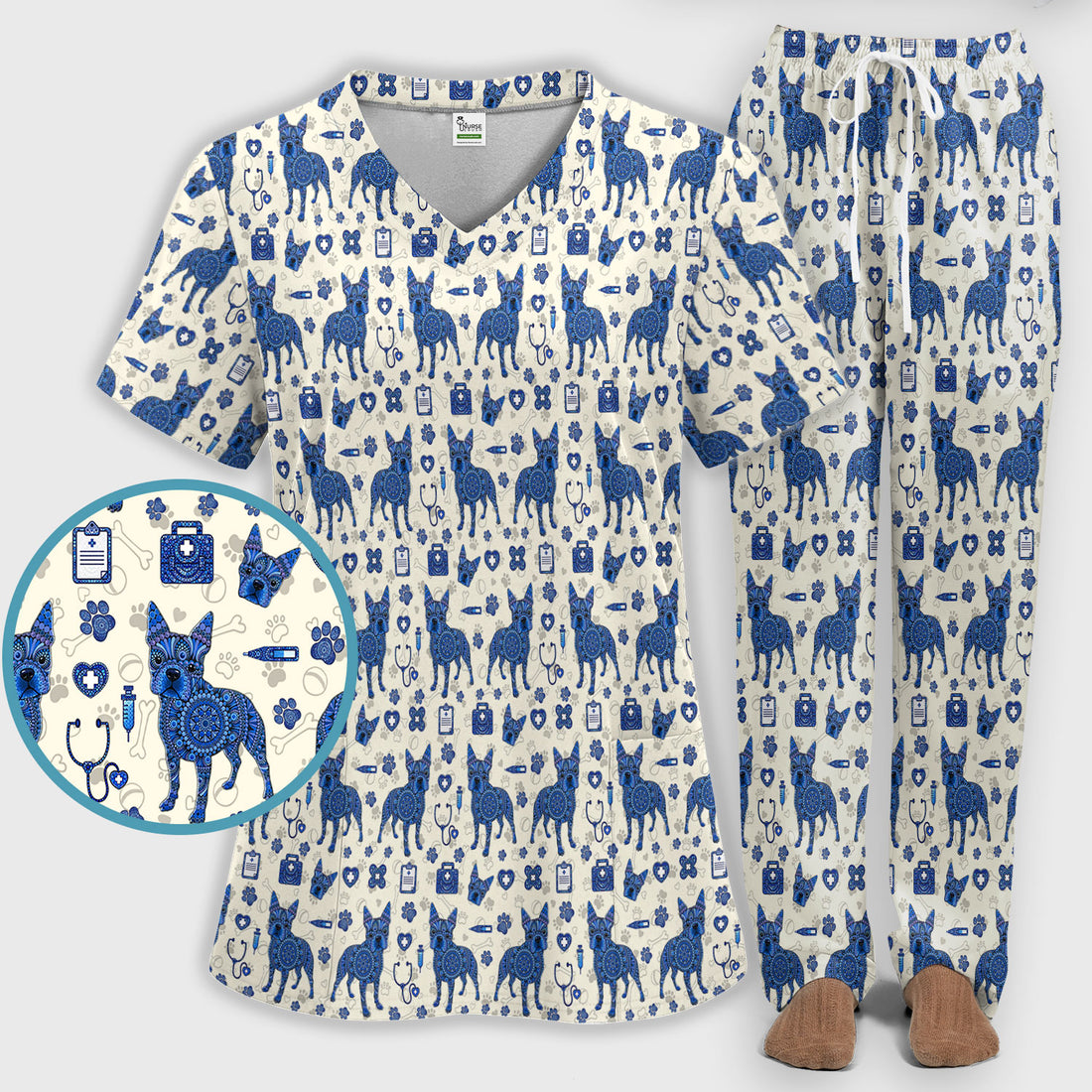 Blue Heeler Australian Cattle Dog Scrub Set, Australia Dot Art Pattern Shirt, Breathable Fabrics Nursing Uniform