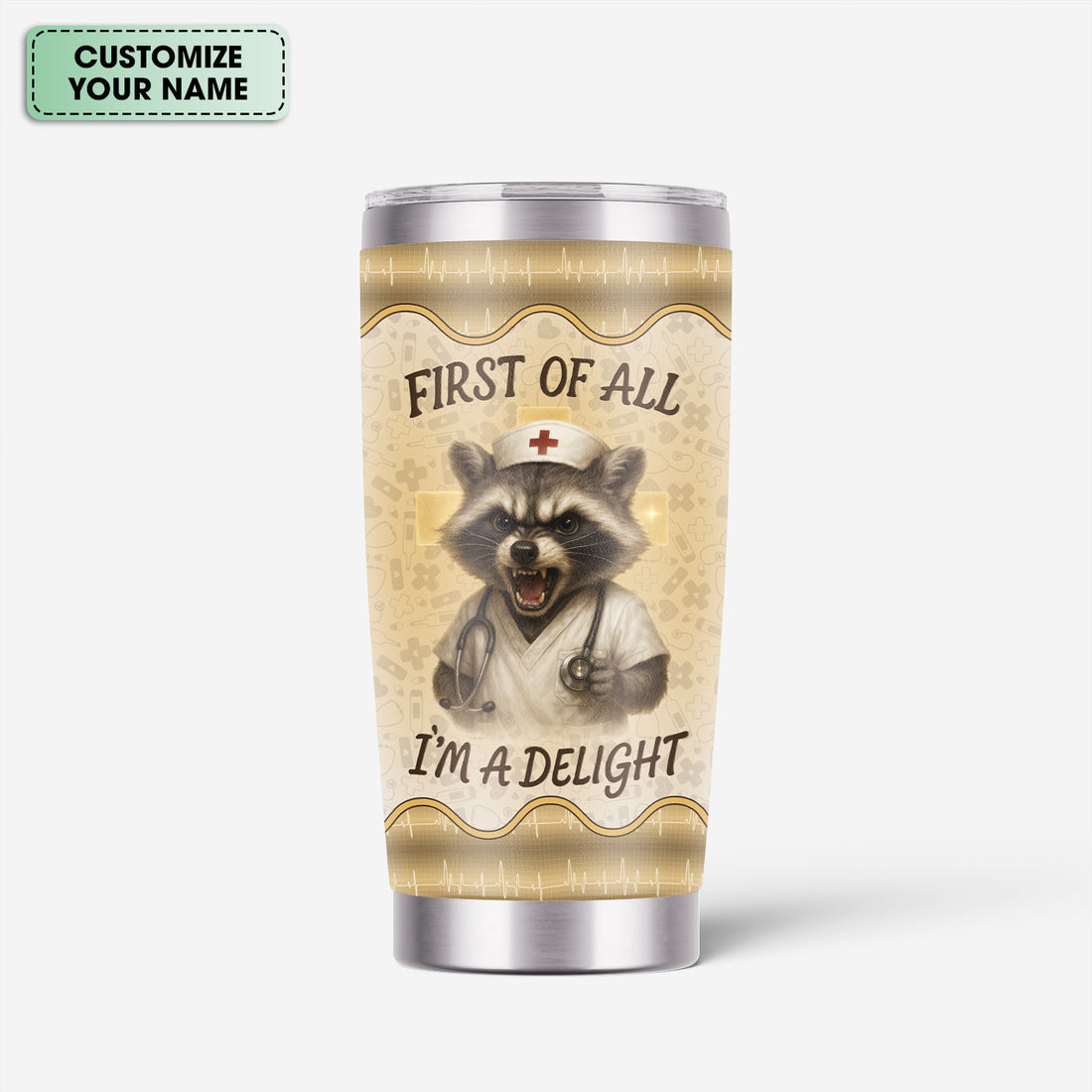 Funny Nurse Tumbler - First Of All I'm A Delight - Personalized Raccoon Mug with Name - Gift for RN CNA LPN Women - Stainless Steel Travel Cup