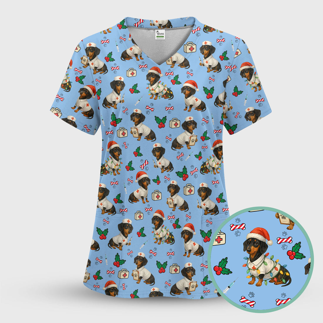 Dachshund Nurse Christmas Scrub Shirt - Cute Sausage Dog Scrub Top Multi Colors - Funny Holiday Nursing Workwear with Pockets