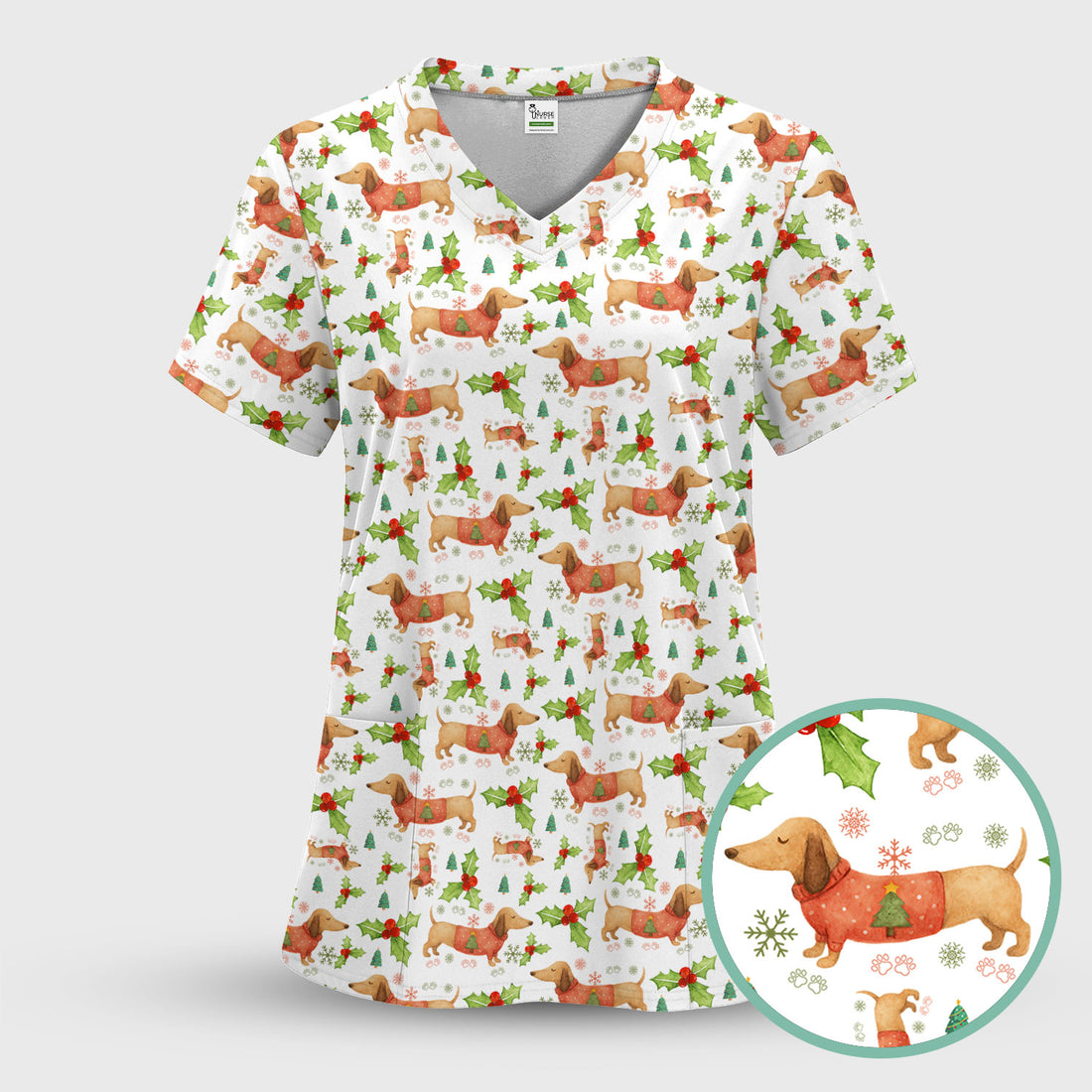 Festive Holiday Dachshund Scrub Top - Funny Sausage Dog Christmas Shirt - Wiener Puppy Lover Gift for RN CNA LPN