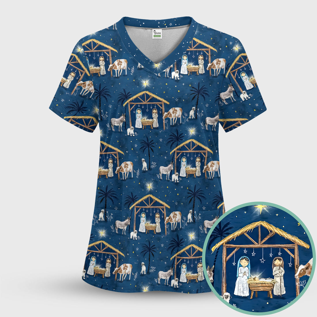Christmas Nativity Scrub Top for Women - Holy Night Manger Scene - Religious Holiday Nursing Uniform Shirt