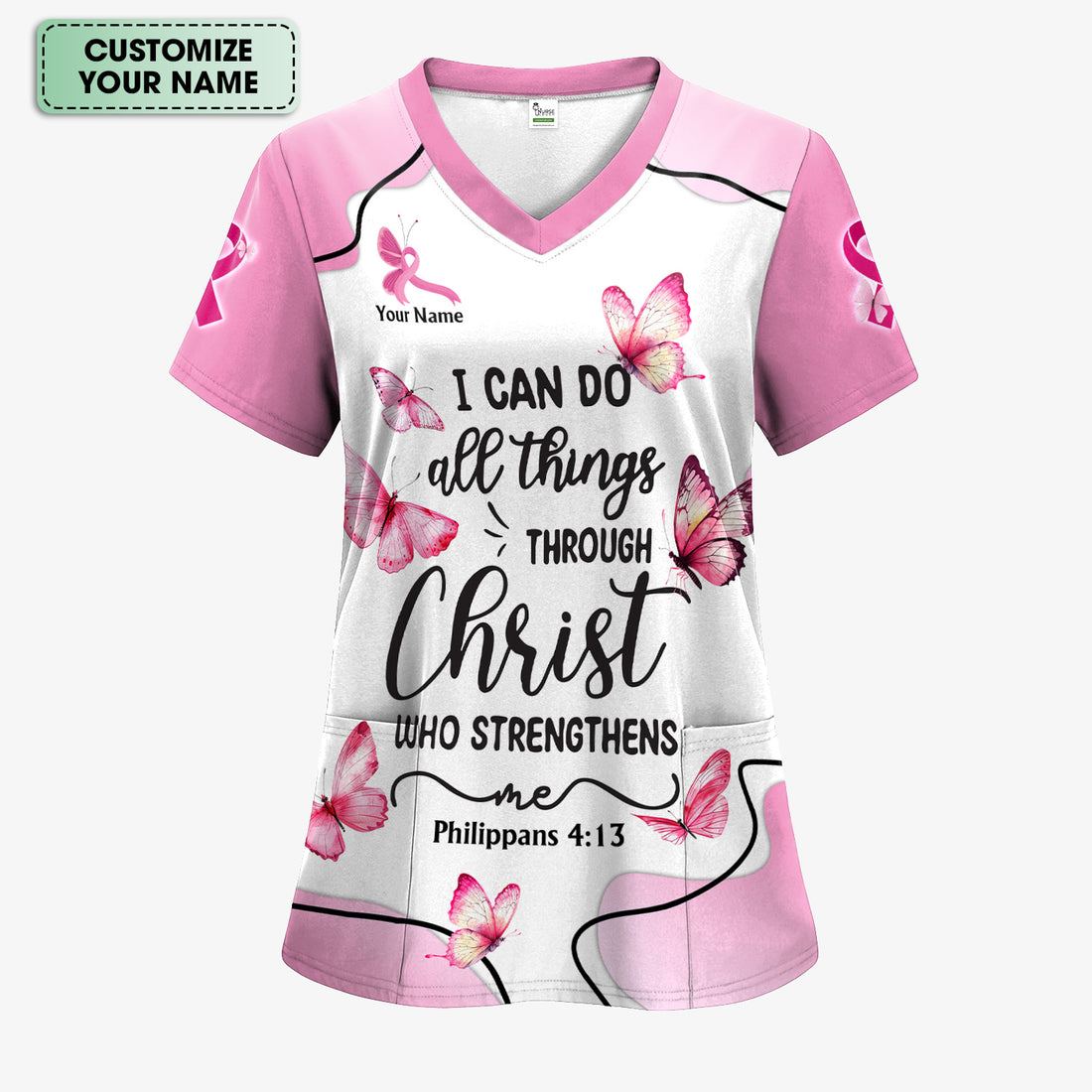 Personalized Christian Butterfly Scrub Top for Nurse - Bible Verse All Things Through Christ - Gift for RN LPN CNA
