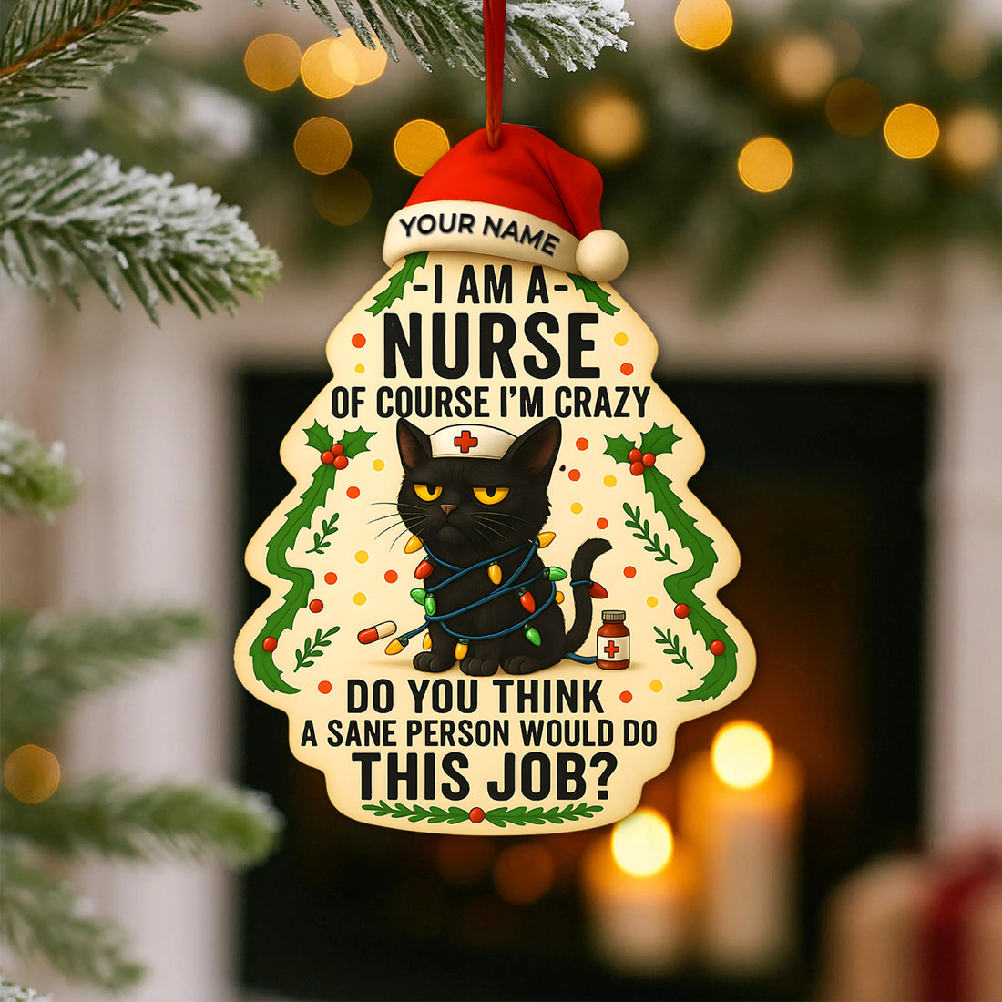 Custom Name Nurse Cat Ornament, Christmas Tree Medical Design, RN LPN CNA Healthcare Workers Gift