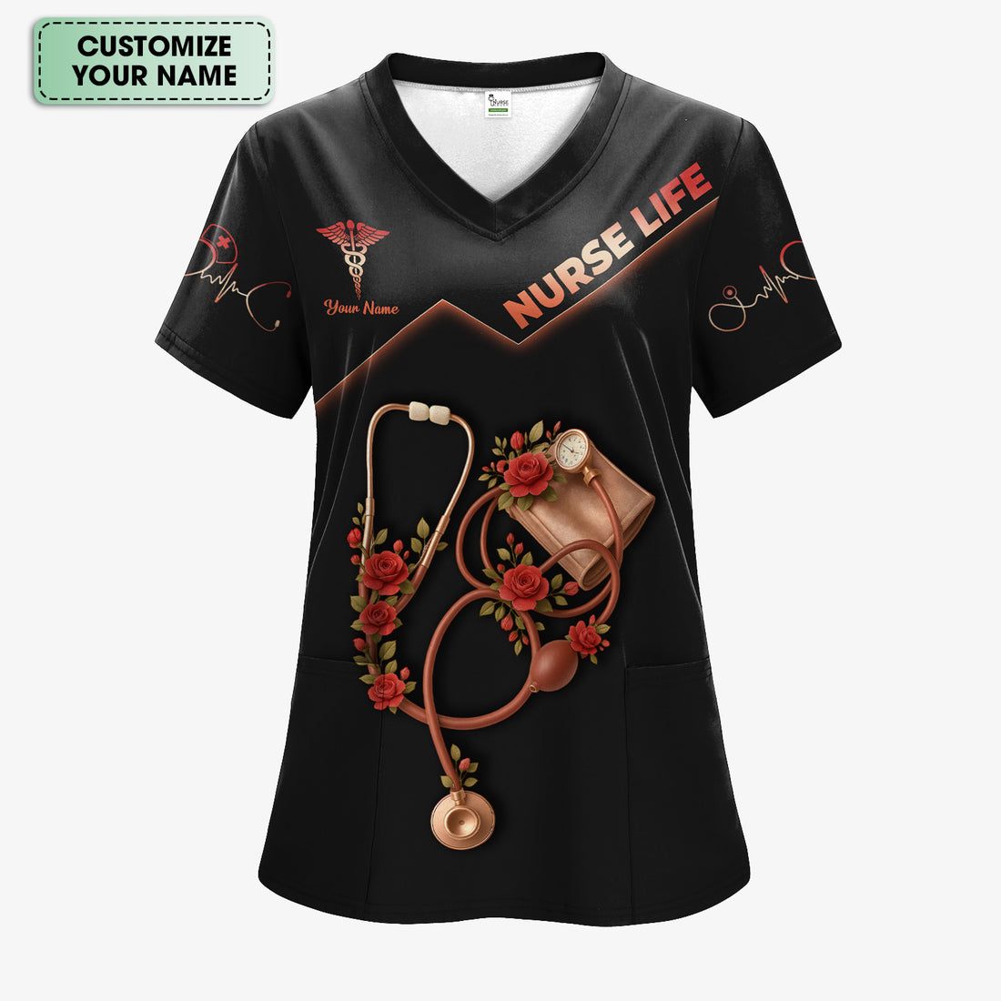 Personalized Nurse Life Scrub Top for Women - Customizable Nursing Scrub Top with Roses and Stethoscope - Gift for RN LPN CNA