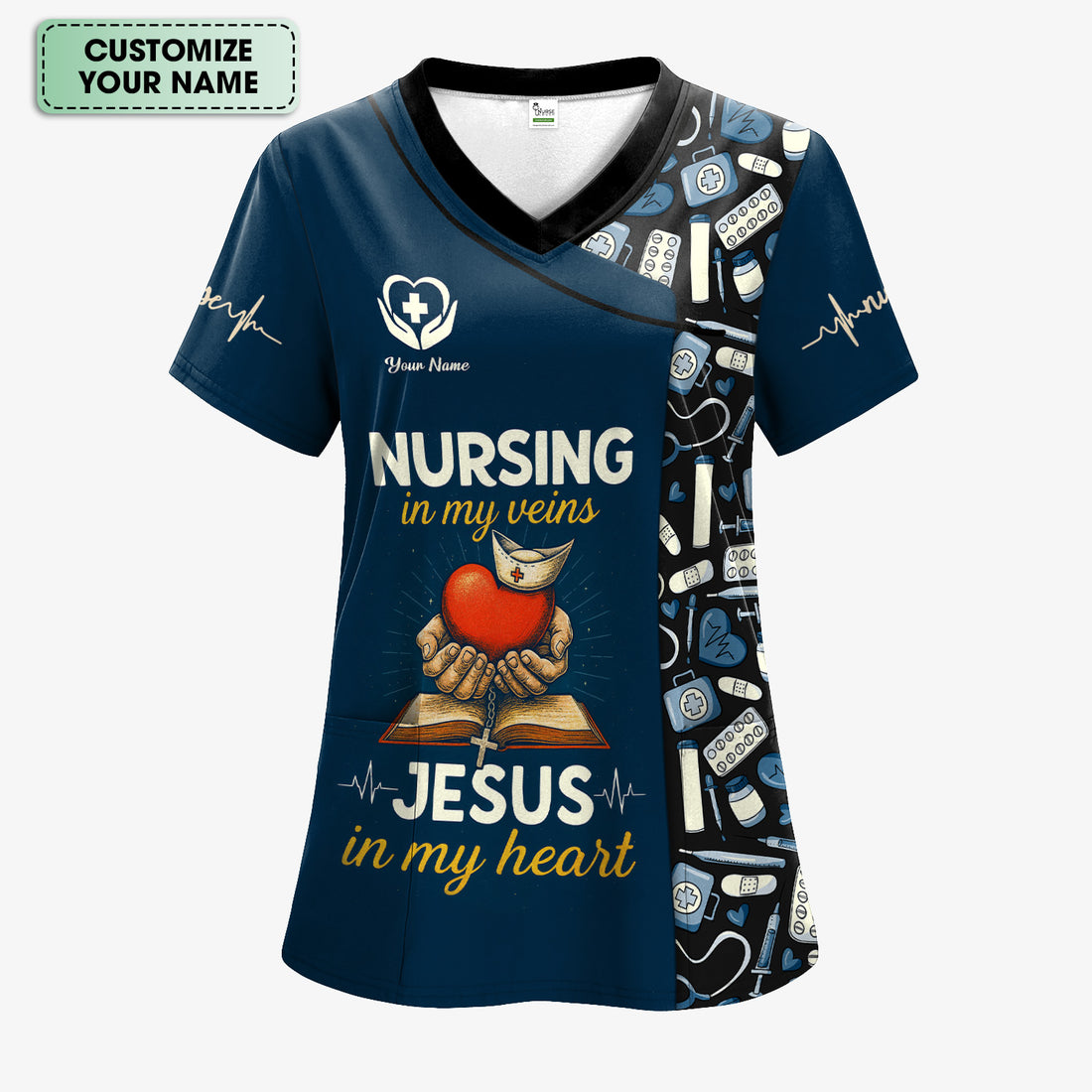 Custom Name Nurse Scrub Top - Nursing in My Veins Jesus in My Heart Quote - Gift for RN LPN CNA