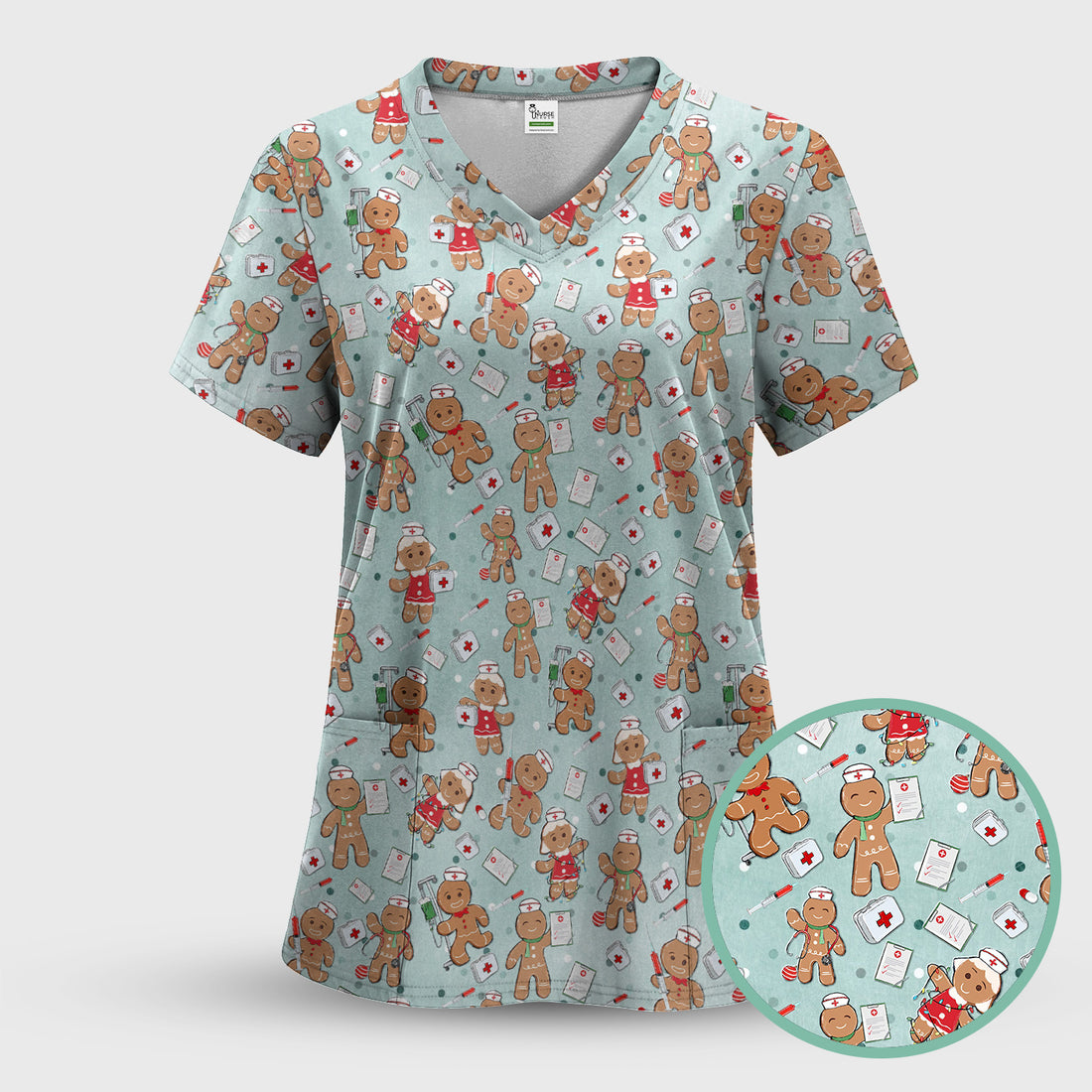 Cute Nurse Christmas Scrub Top - Funny Gingerbread Man & Medical Design - Gift for Women RN LPN & Pediatric Nurses