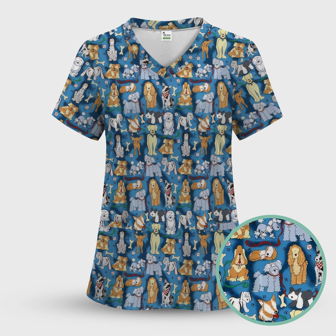Cute Dog Lover Scrub Top for Nurse - Cartoon Dog Breeds Pattern Design - Gift for RN LPN CNA Women Healthcare Staff