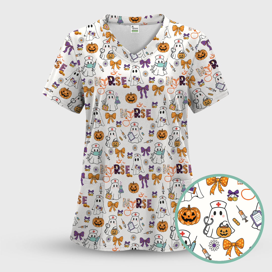 Funny Halloween Nurse Scrub - Kawaii Cartoon Ghost & Medical Design - Gift for Women RN LPN & Pediatric Nurses