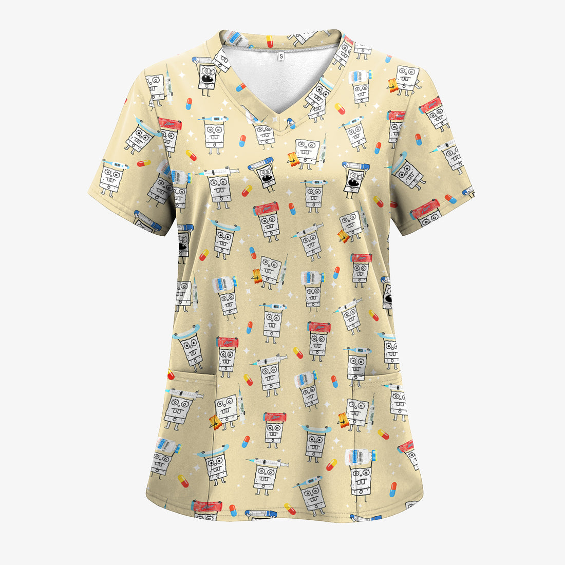 Funny Pharmacist Scrub Top - All-Over Print Doodle Medical Characters - Gift for RN LPN BSN Women